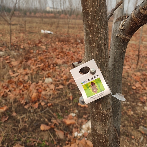 2、释放时,先把包装管夹在制作好的纸卡中,打开棉塞,再将纸卡按管口斜向上45”角度固定在树干上,让花绒寄甲沿纸卡爬出,或直接将管内附着有花绒寄甲的介质放置于蛀孔附近。